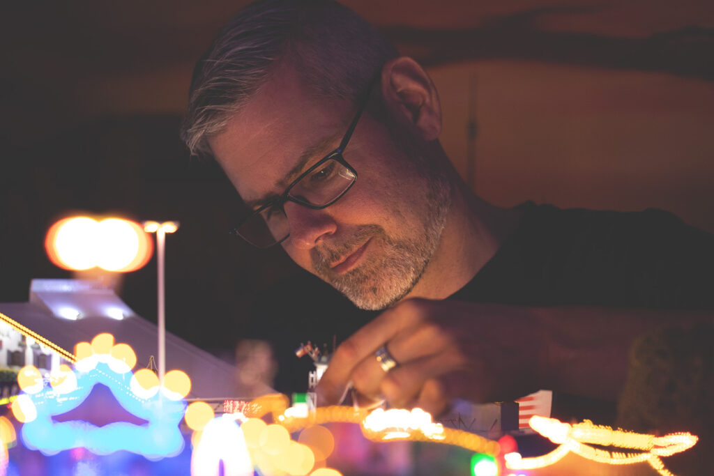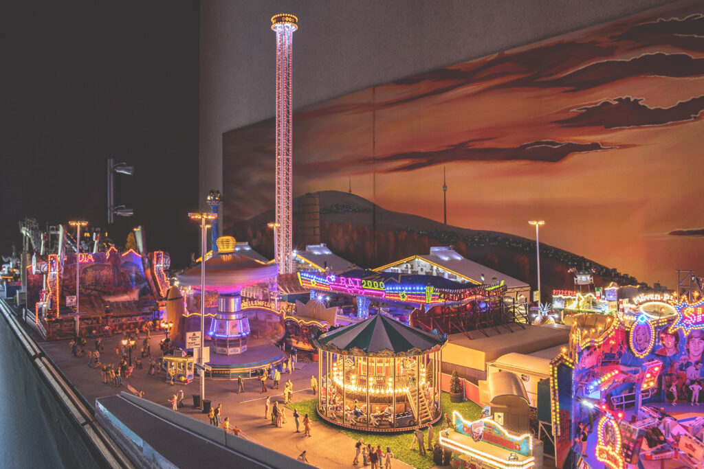 Heute schaut Andreas Ciupek auf über zwei Jahrzehnte Kirmesmodellbau zurück. Sein großes Meisterwerk ist das Modellbaudiorama des Cannstatter Wasens, dem zweitgrößten Volksfest Deutschlands. Mittlerweile ist das Modell auf beachtliche vier Meter Frontlänge angewachsen. Andreas legt größten Wert auf Originaltreue: Die Bewegungsabläufe der zahlreichen Fahrgeschäfte, die hochkomplexe, computergesteuerte LED-Beleuchtung – alles muss authentisch sein, so wie es der Wasen-Besucher erleben würde.