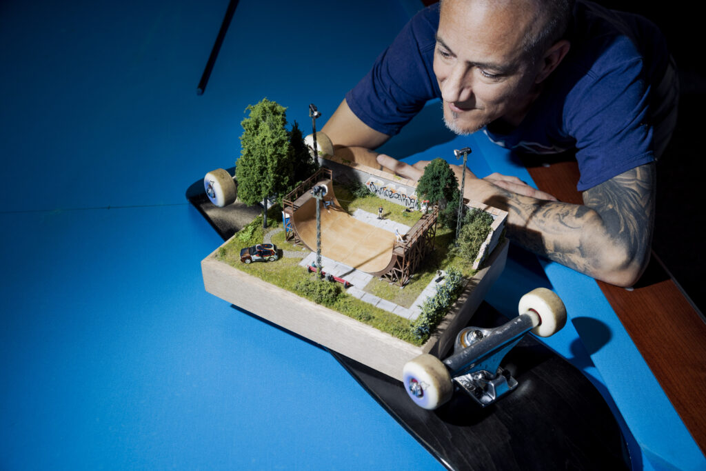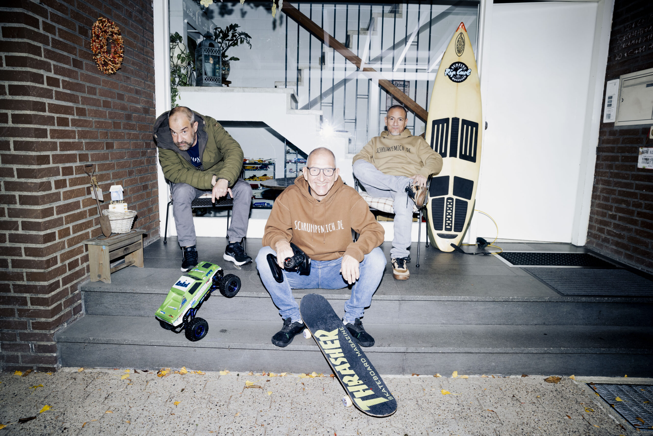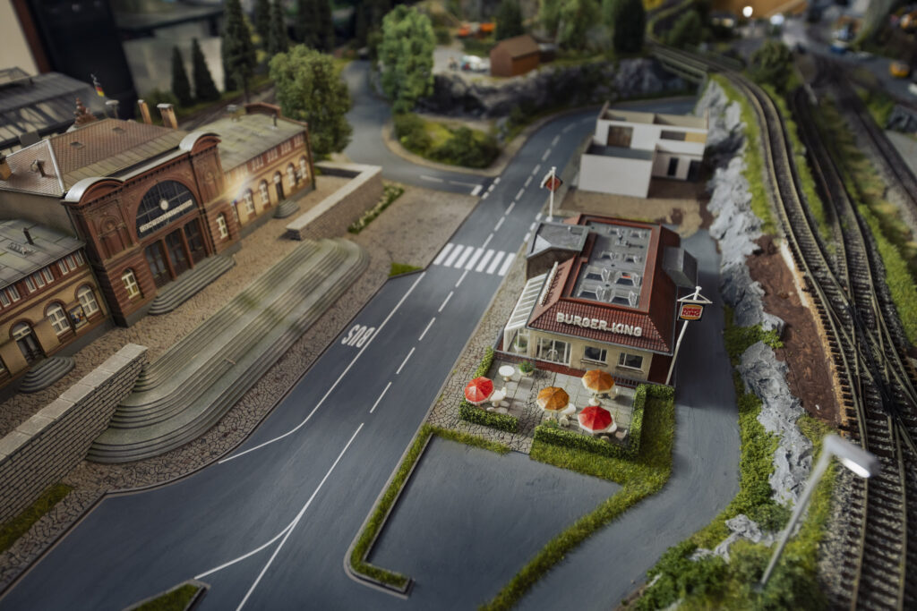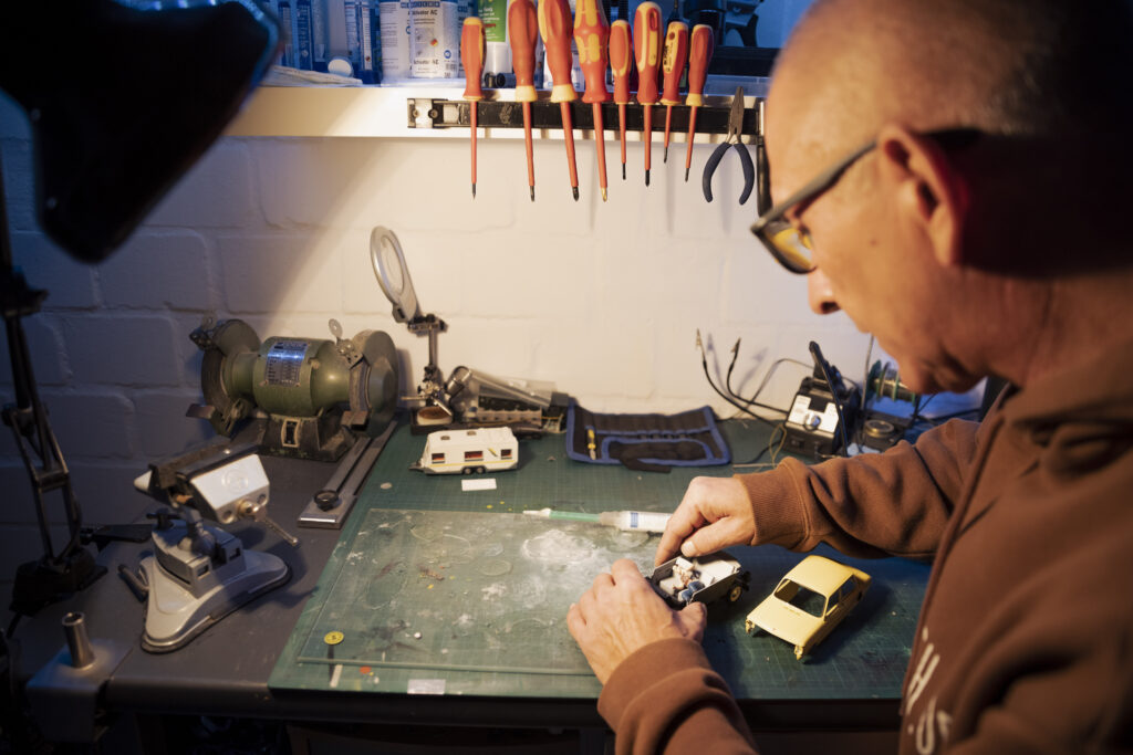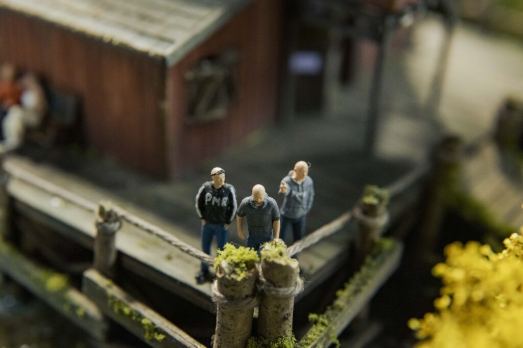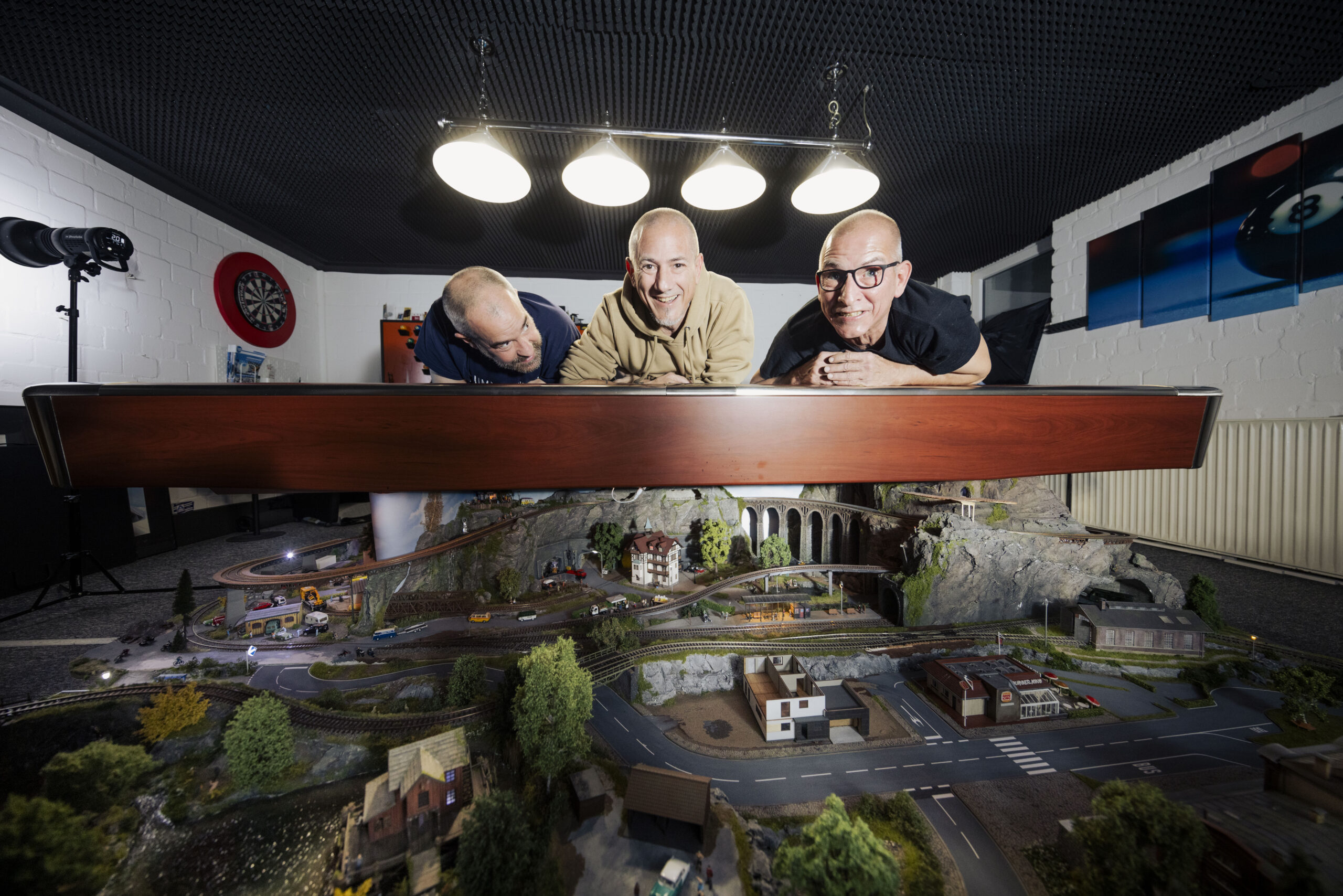 Zu Weihnachten holen die Brüder die Anlage vom Dachboden und bauen sie auf. Ort des Geschehens ist der heimische Hobbykeller in Sendenhorst nahe Münster. Hobbykeller ist eine maßlose Untertreibung. Hier befindet sich ein echtes Paradies für erwachsene Kinder, mit Billardtisch, Dartscheibe und Modellautos. Eine Männerhöhle, in der sich auch das gemeinsame Geschäft befindet, das sich aus der Modellleidenschaft ergeben hat: schrumpfmich.de. Hier können sich Kunden mithilfe einer Fotografie zu einer Modellfigur schrumpfen lassen. Entstanden aus dem einfachen Wunsch, aktuelle Figuren, Freunde und sich selbst in die Miniaturlandschaft einzubauen.