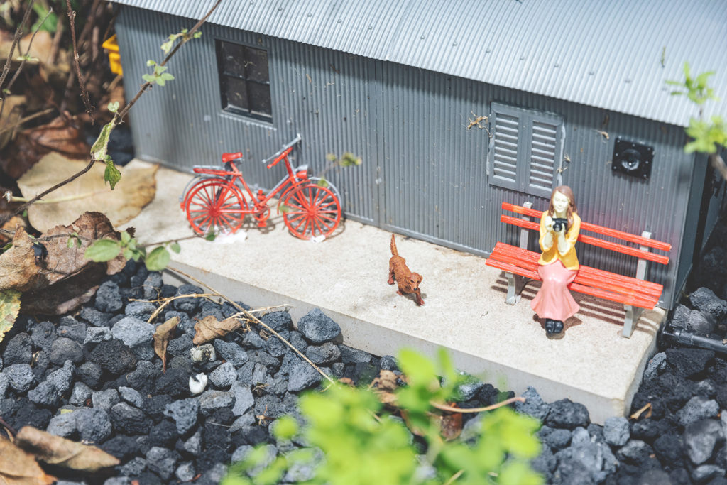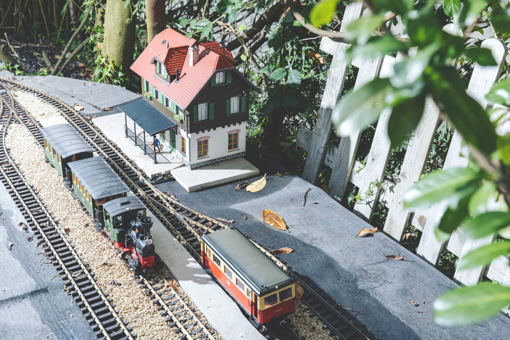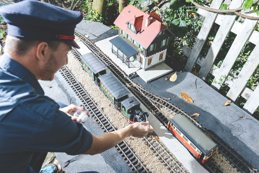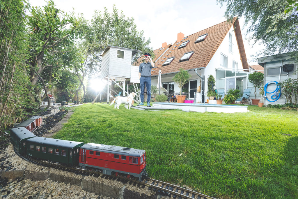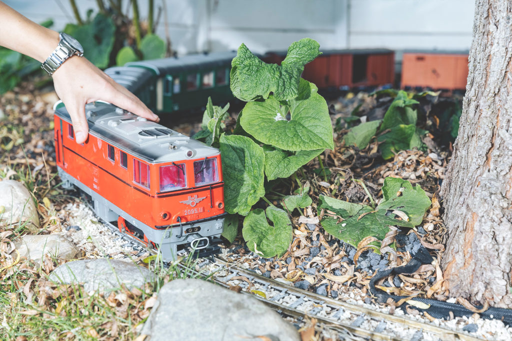 So hat er auch für seine Gartenbahn ältere Modelle gekauft, die sich nun nach seiner Veredelung in exzellentem Zustand befinden. So viel wie möglich baut er selbst wie etwa Gebäude und Bäume. Kauft er doch einmal einen fertigen Satz, wird dieser fachmännisch gealtert.